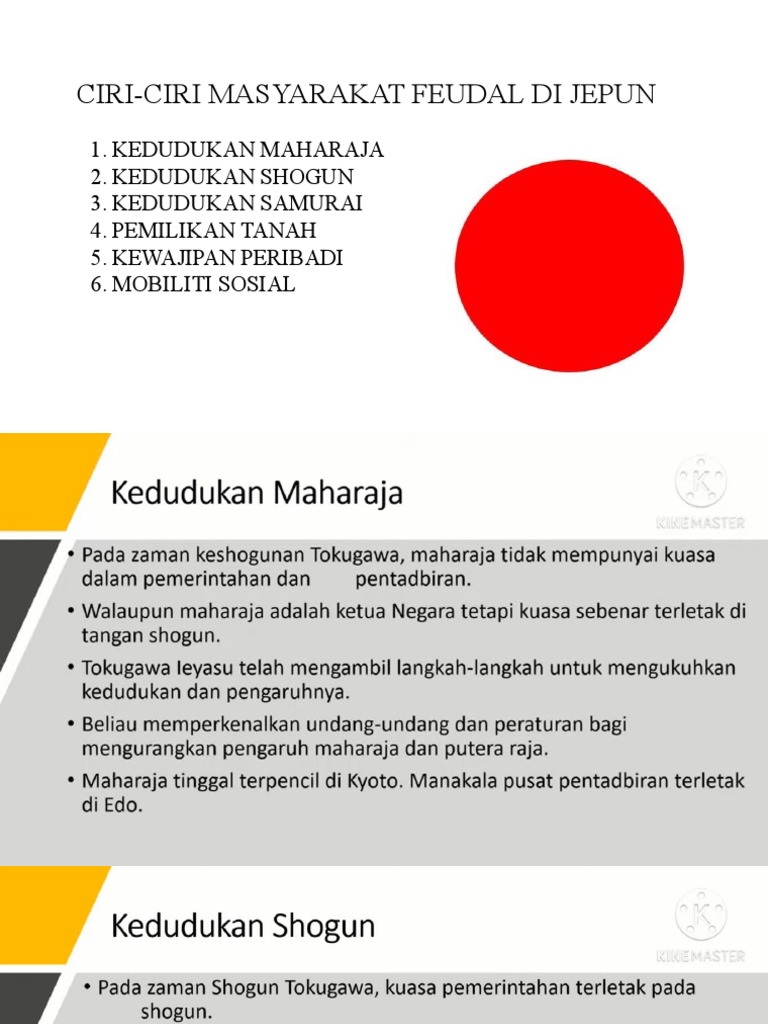 Huraikan ciri-ciri masyarakat feudal yang diamalkan. Antaranya ialah Kedudukan Maharaja Kedudukan Shogun Kedudukan Samurai Pemilikan Tanah Kewajipan Peribadi dan Mobiliti Sosial. Sistem feudal juga dapat dilihat dengan jelas iaitu Maharaja yang berada di kemuncak struktur pemerintahan mempunyai kuasa yang tidak terhad ke atas segala aspek di bawah pemerintahannya termasuklah tanah.